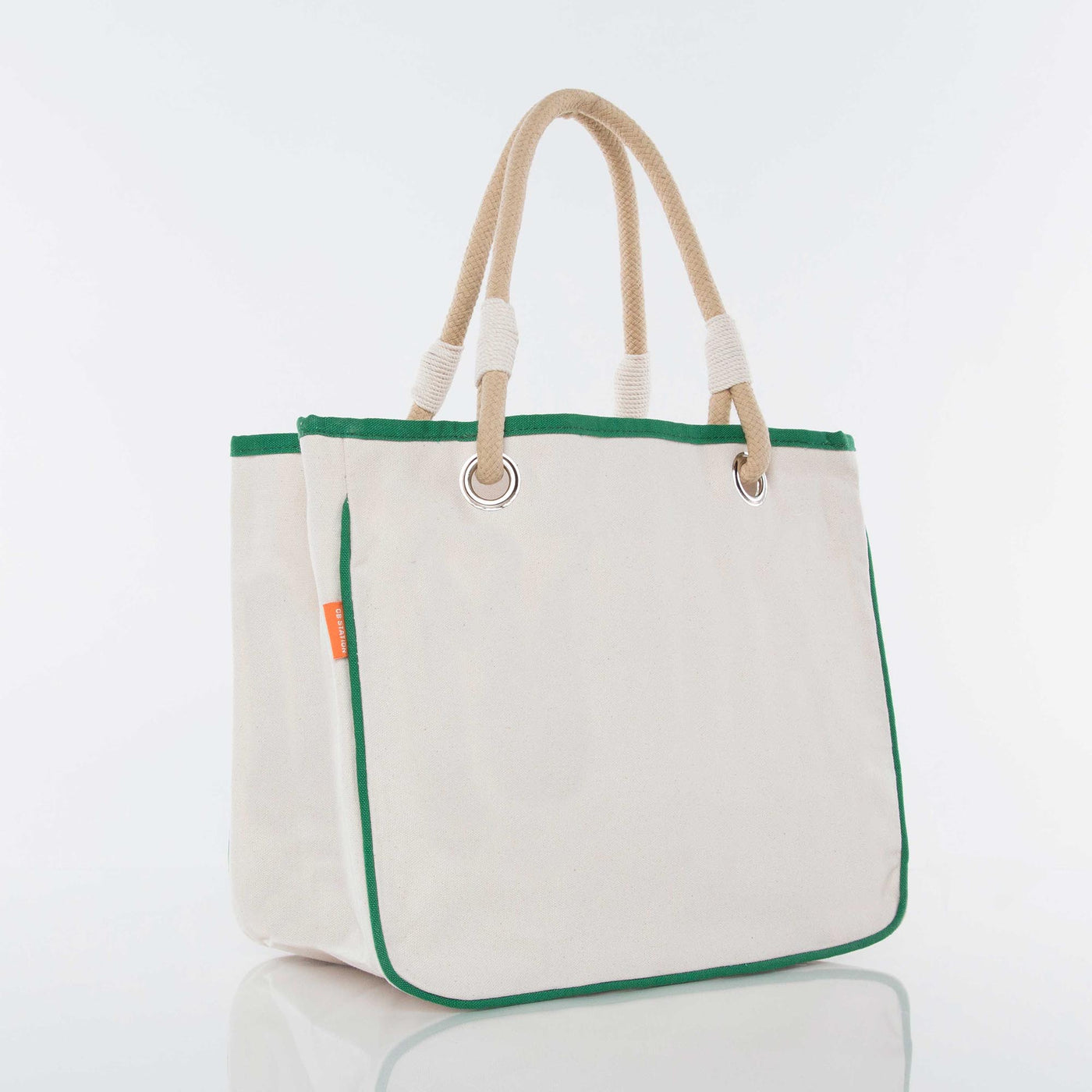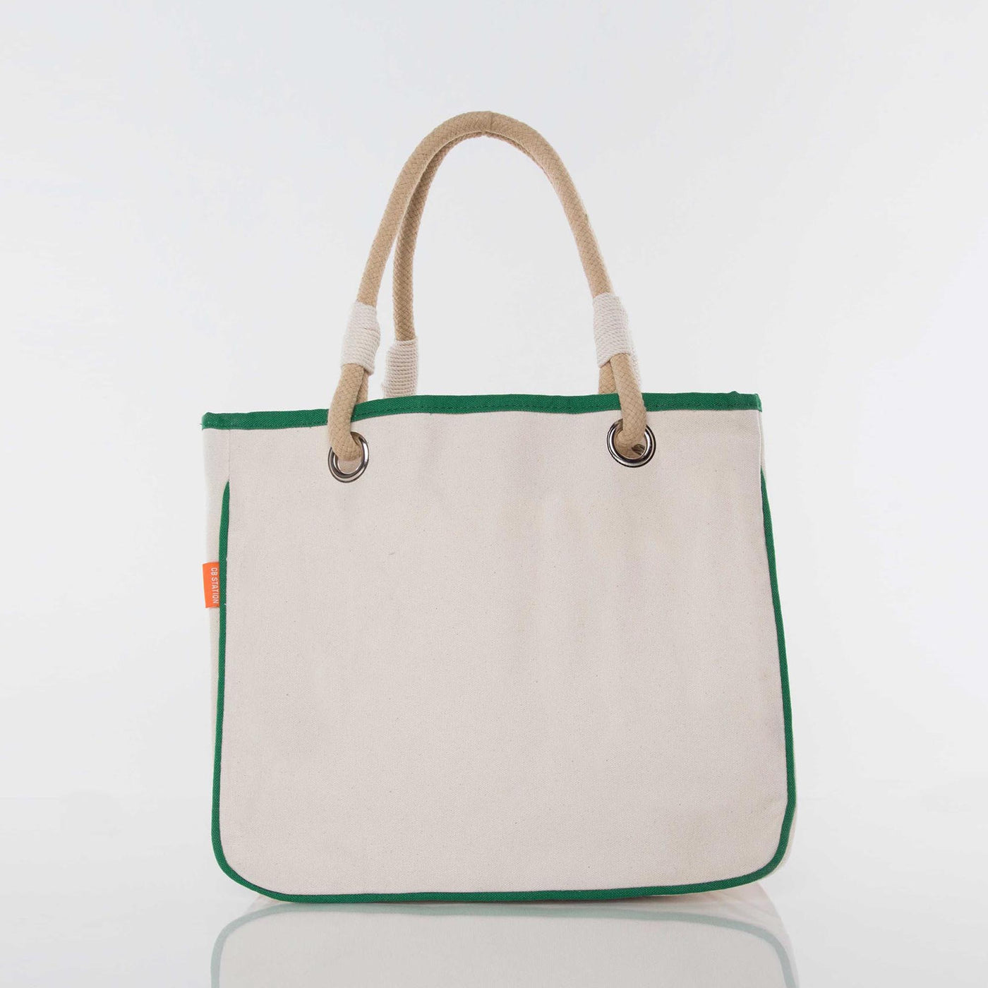 The Canvas Rope Tote is a charming yet elegant open-top bag with rope handles and contrast piping for a mellow nautical look. A versatile natural canvas tote with emerald trim and sturdy rope handles. Perfect for errands, beach days, or gifting to bridesmaids, teachers, and anyone who appreciates timeless style.
