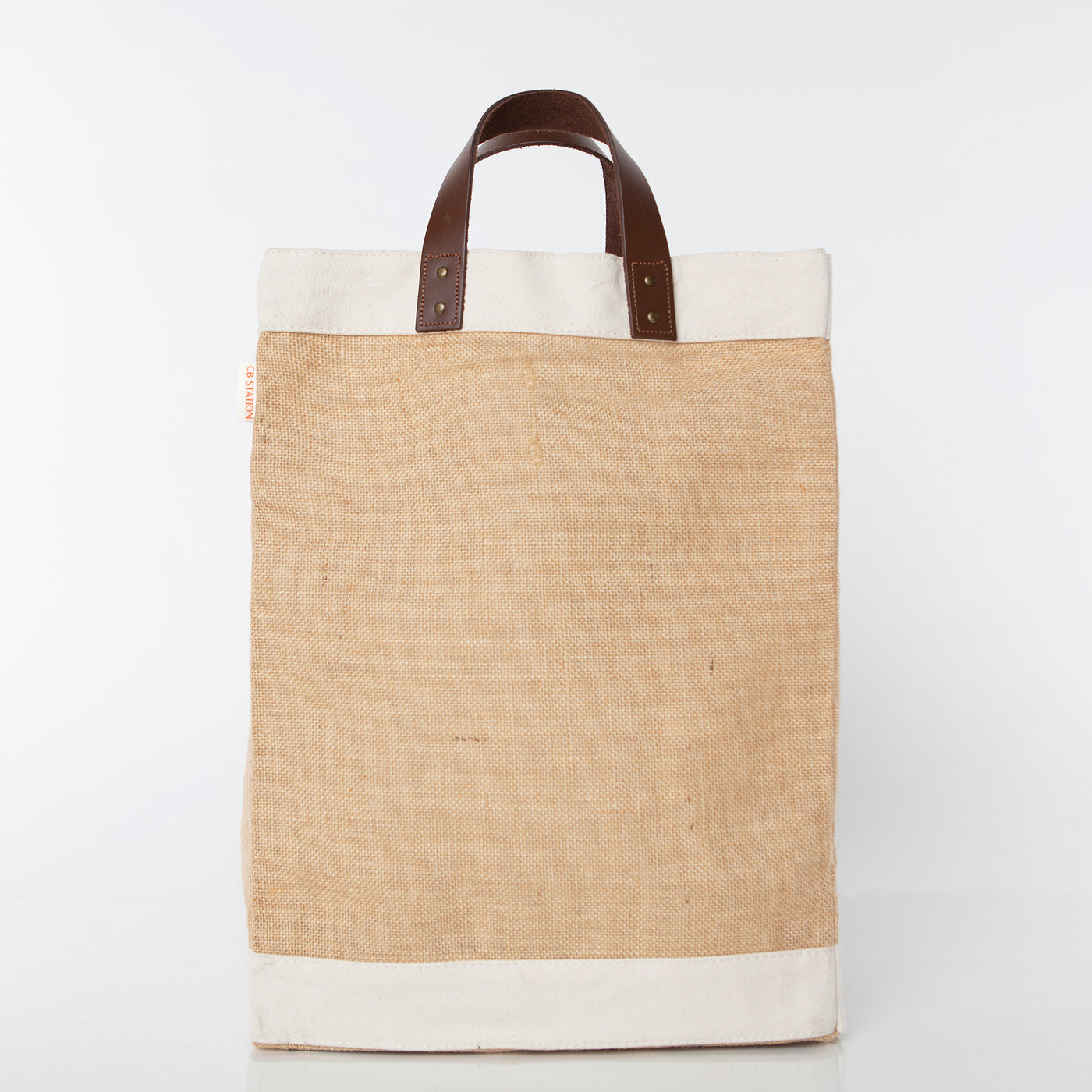 The large Natural Jute Market Bag is the ideal tote for grocery shopping in style or trips to the farmers market. Safely carries groceries and food. This self-standing, open top tote features sturdy rich brown leather handles, and a smooth laminate finish inside, making it easy to clean after repeated use.