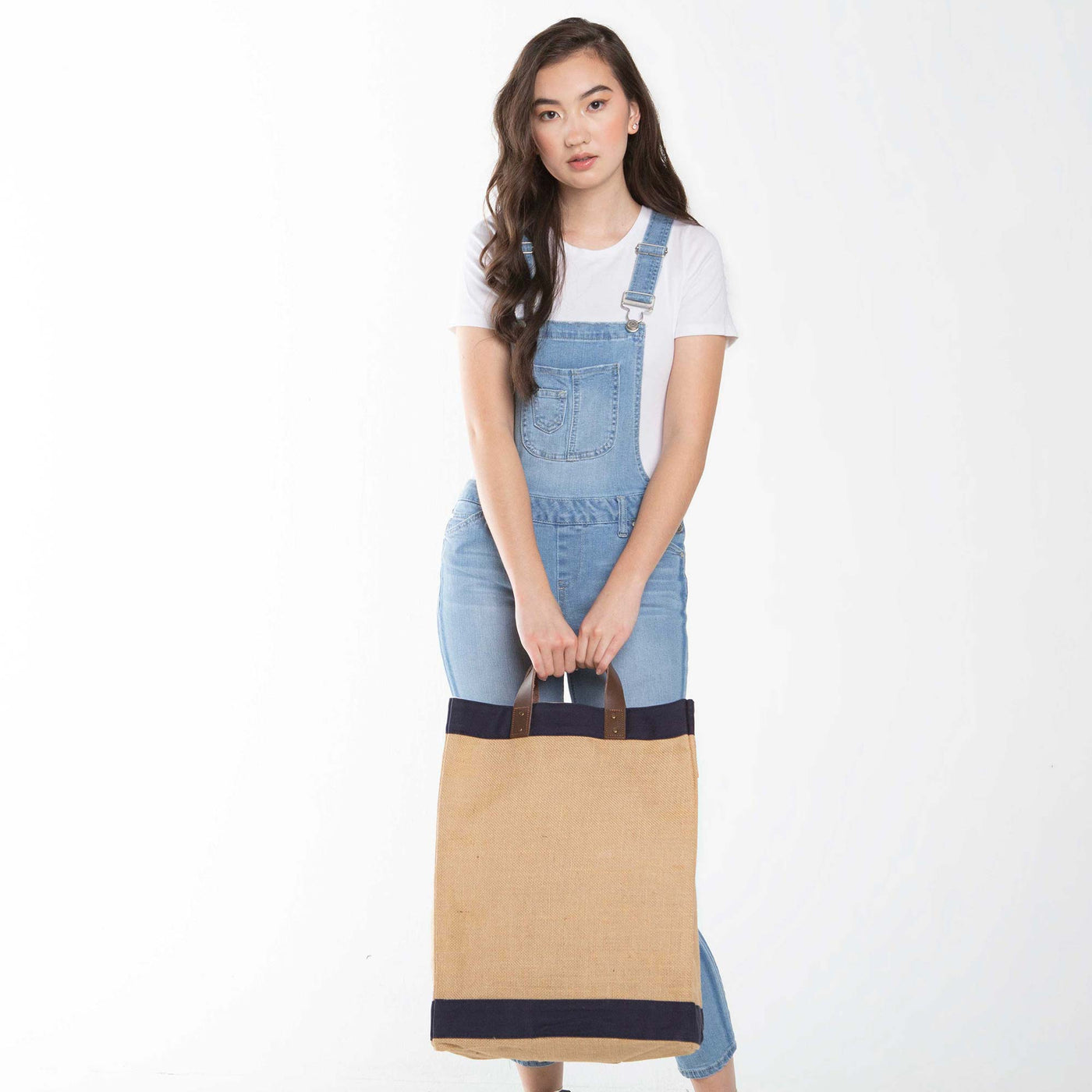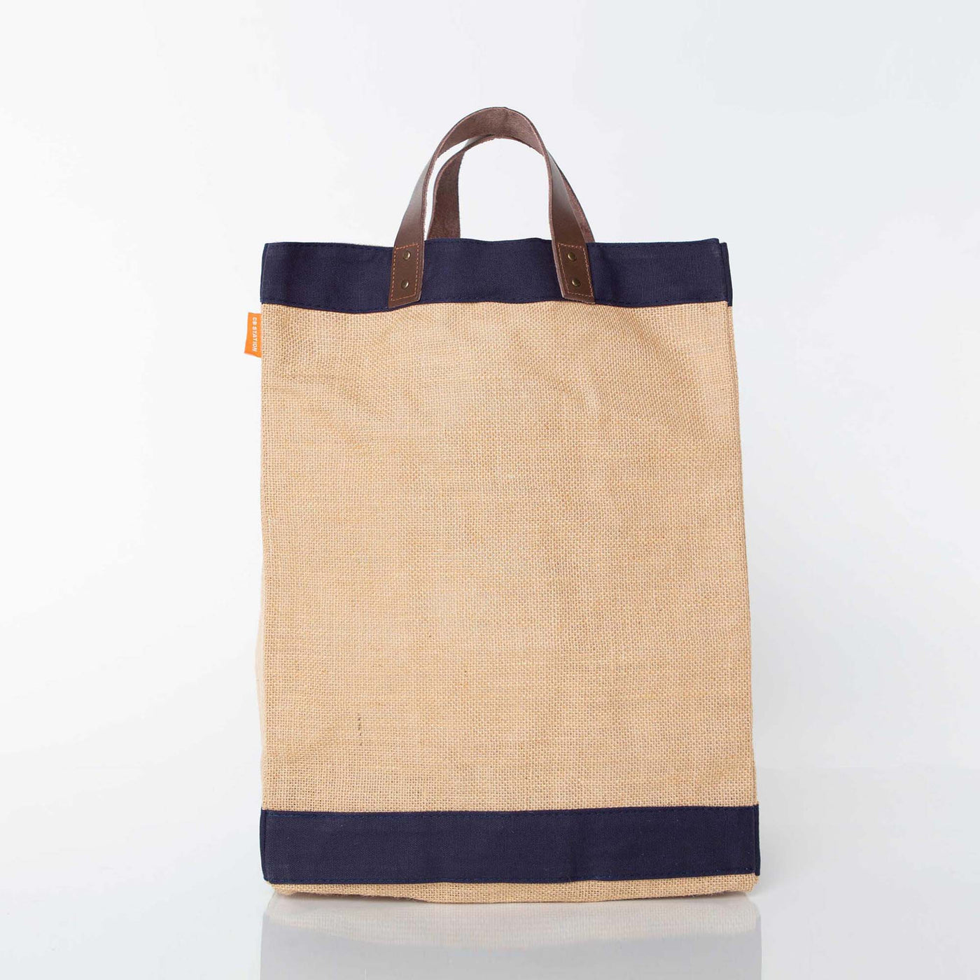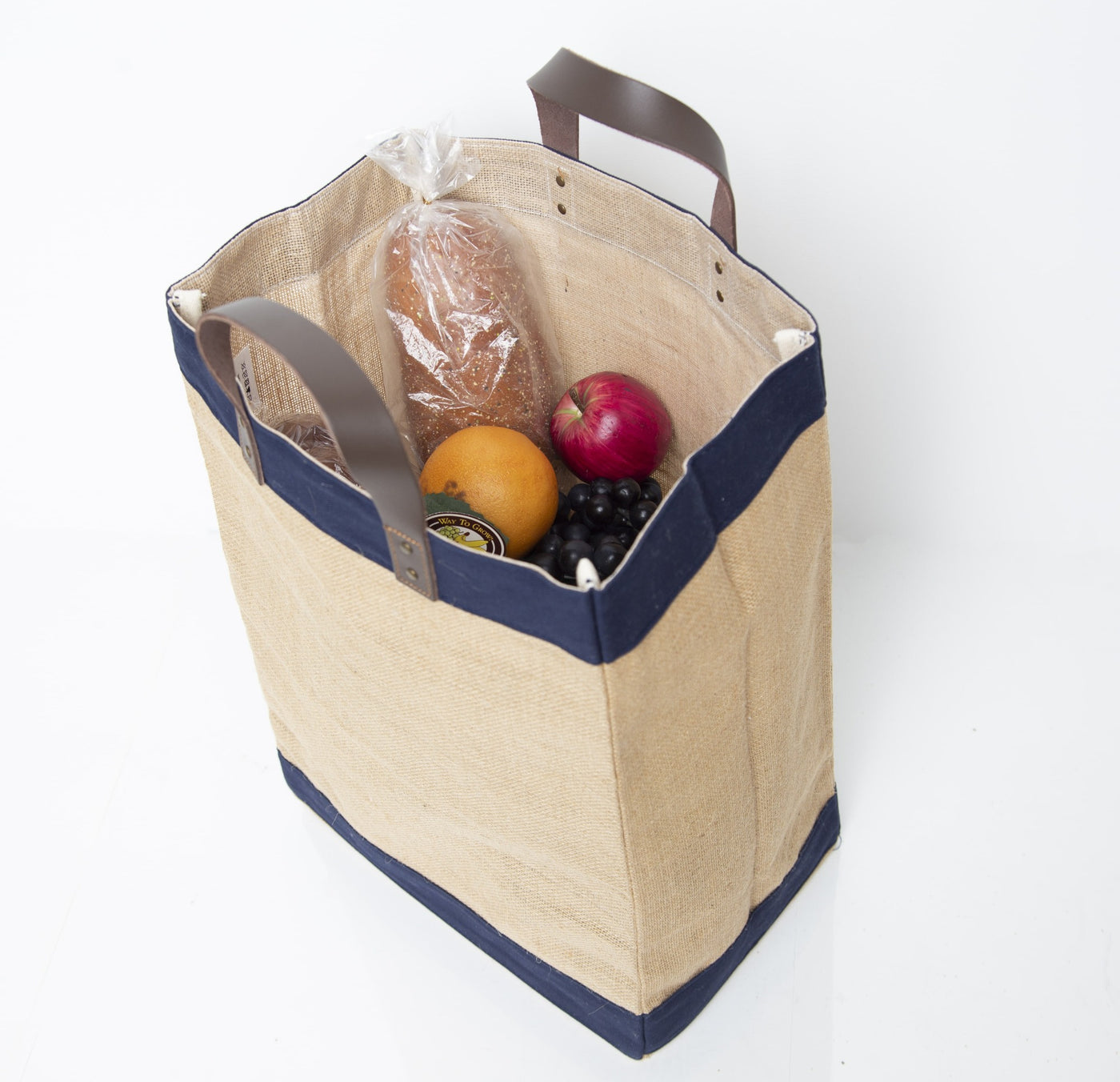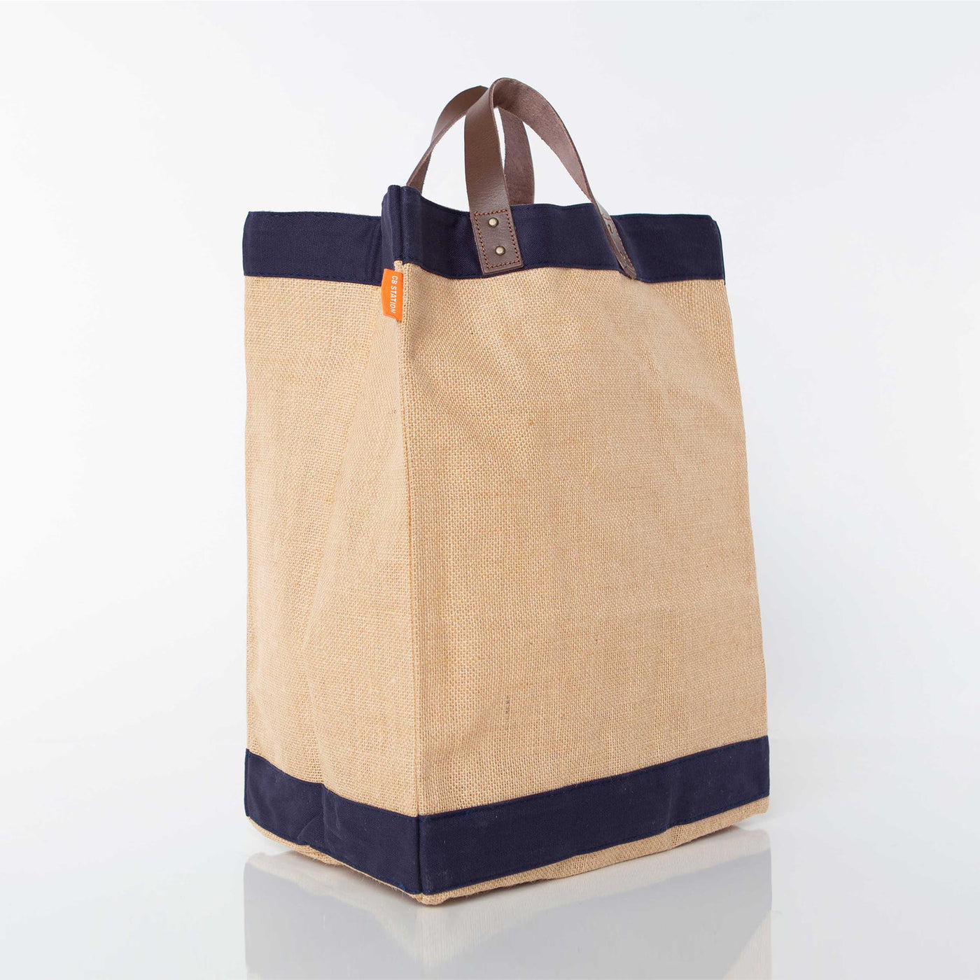 The large Navy Jute Market Bag is the ideal tote for grocery shopping in style or trips to the farmers market. Safely carries groceries and food. This self-standing, open top tote features sturdy rich brown leather handles, and a smooth laminate finish inside, making it easy to clean after repeated use.
