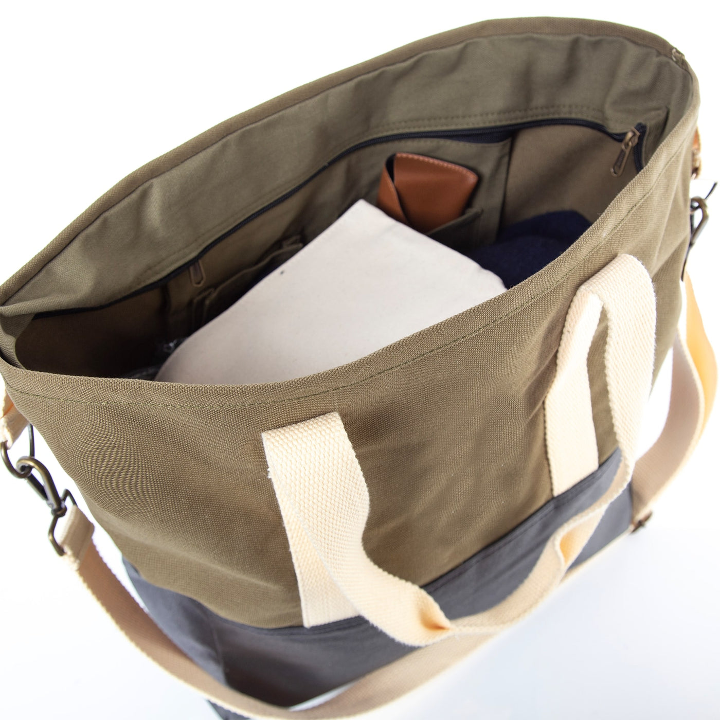 The internal organizer features a zipper pocket and two open pockets, making it an excellent storage solution for items like keys and small devices.