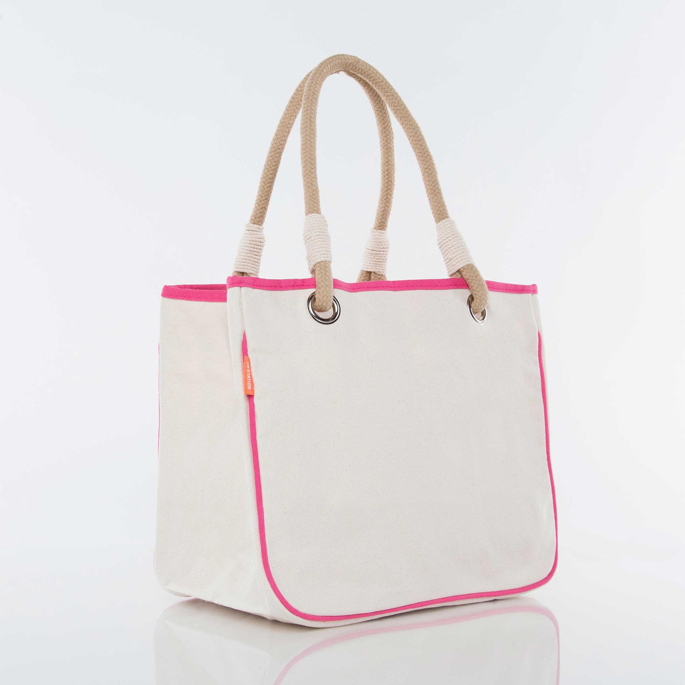 The Canvas Rope Tote is a charming yet elegant open-top bag with rope handles and contrast piping for a mellow nautical look. A versatile natural canvas tote with hot pink trim and sturdy rope handles. Perfect for errands, beach days, or gifting to bridesmaids, teachers, and anyone who appreciates timeless style.