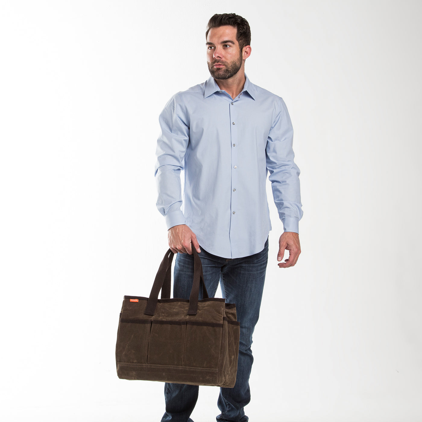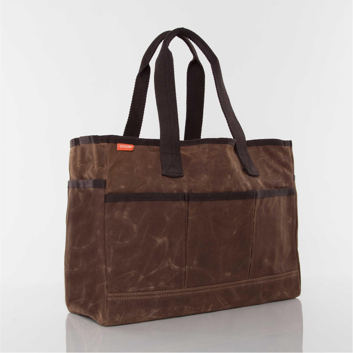The possibilities are endless when it comes to this khaki waxed canvas Utility Tote with rich brown trim. Whether you use it as a garden carryall, a tool tote, a baby bag or for a trip to the farmers market, it just plain works. Featuring eight outside pockets, and a spacious open top interior, we know whatever it is you have in store for it - you won't run out of places to put things!