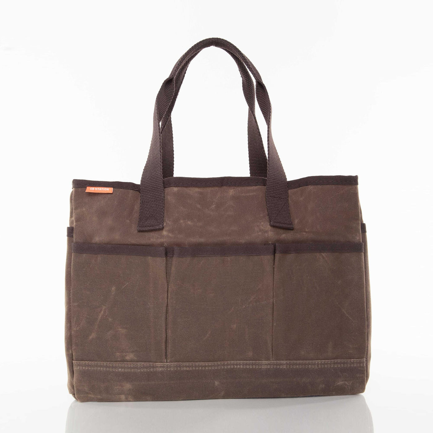 The possibilities are endless when it comes to this olive waxed canvas Utility Tote with rich brown trim. Whether you use it as a garden carryall, a tool tote, a baby bag or for a trip to the farmers market, it just plain works. Featuring eight outside pockets, and a spacious open top interior, we know whatever it is you have in store for it - you won't run out of places to put things!